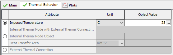 The imposed temperature can be specified in the “Thermal behavior” tab or linked to an external model: