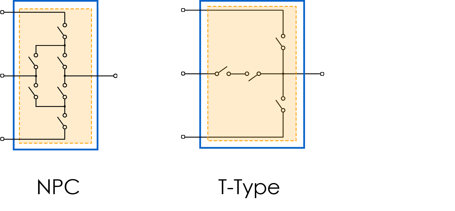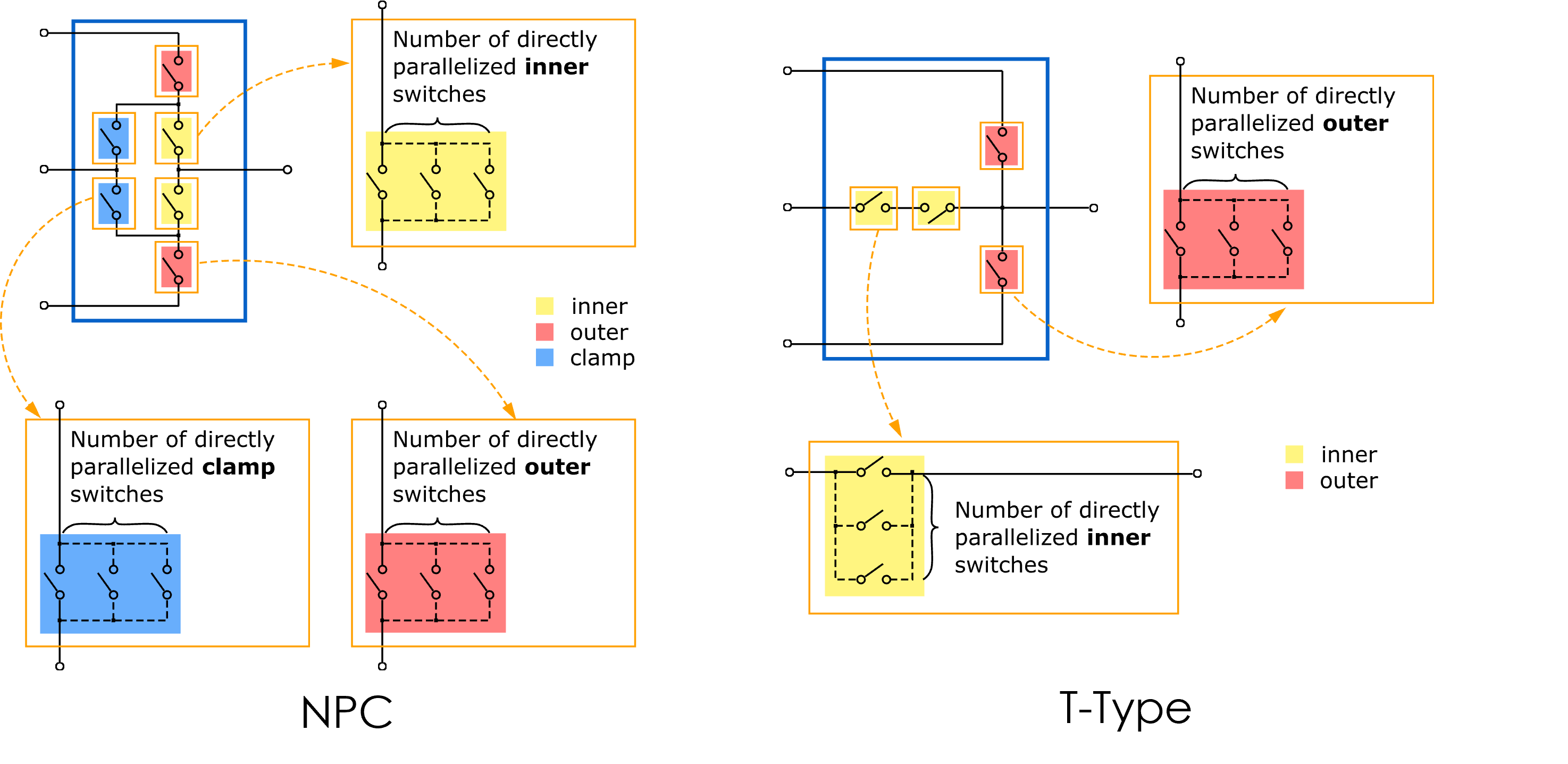 Discrete switches or leg modules can be direct-paralleled to handle larger currents according to the parameter nswitch(par). NPC and T-type modules cannot be direct-paralleled this way.