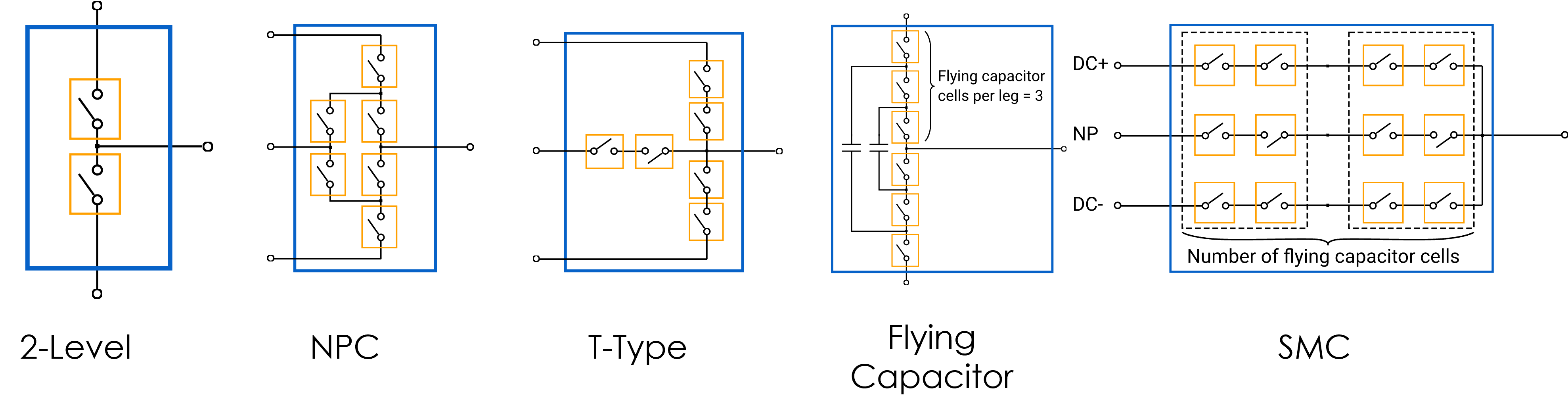 All these topologies can be used for DC/AC applications, but only the 2-level and flying capacitor topologies can be used in DC/DC applications.