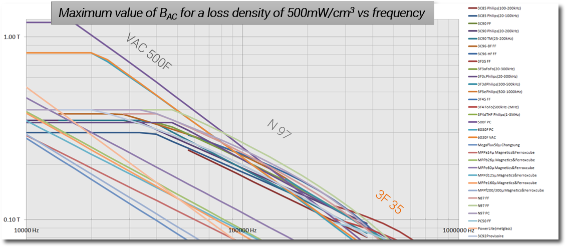 For high ripples and/or switching frequencies, \(B_{ACmax}\) must be reduced to values significantly below \(B_{sat}\) in order to limit core loss density, as illustrated the figure below for different materials (extracted from [1]).