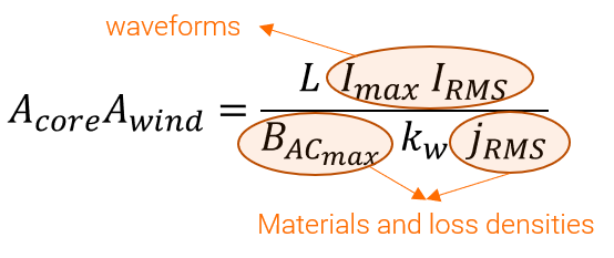 a winding relation: \(N_{turns} \times I_{rms} = k_w \times A_{wind} \times j_{RMS}\)