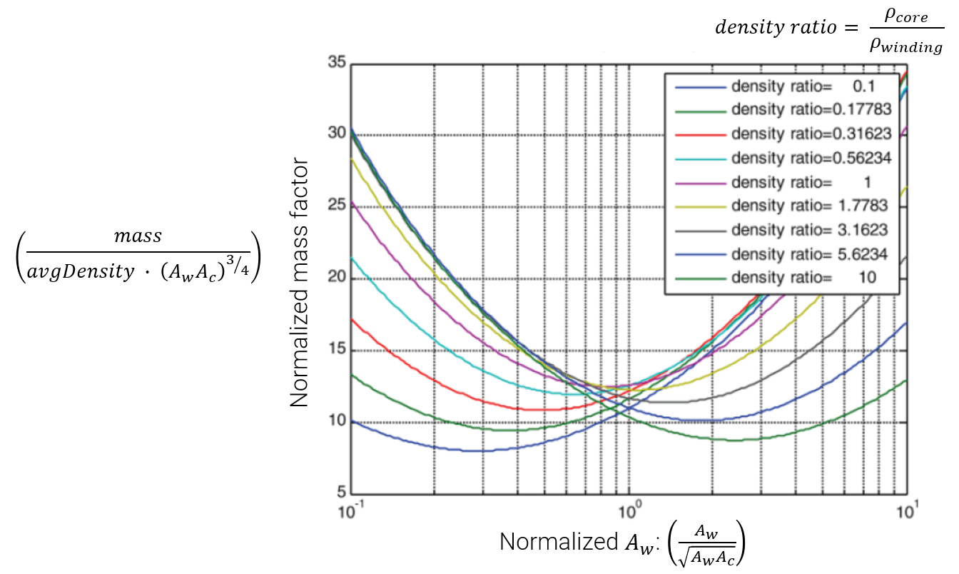 The figure below (extracted from [1]) shows the normalized mass factor vs the normalized winding area: a family of curves corresponding to different density ratios are plotted to show that a minimum weight is obtained for different values of \(A_{wind}\). The interpretation is easily understandable: when the magnetic density is higher than conductor density (i.e. density ratio > 1, the right part of the figure), the proportion of magnetic material should be smaller thant the proportion of conductor material.