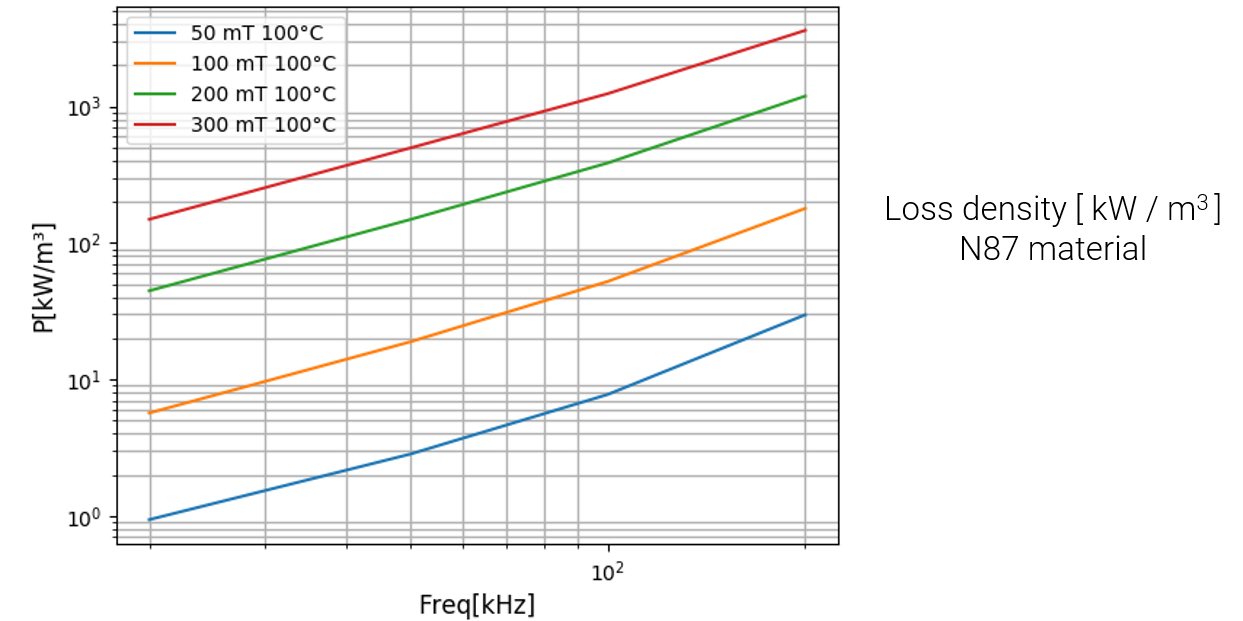 The core losses are computed from the core volume and the selected material’s loss density. This loss density depends on maximal induction \(B_{ACmax}\) and frequency f as shown in figure below: