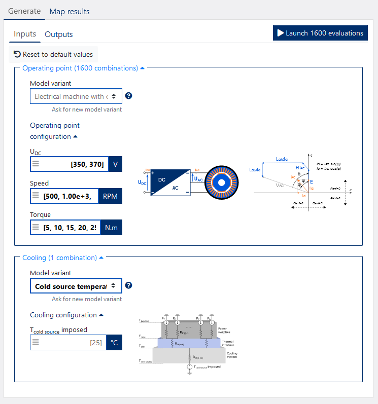 For the Operating point section, the model variant is selected, and the operating point configuration is filled in with an array of values for every input parameter. The number of input values of each parameter determines the number of combinations.