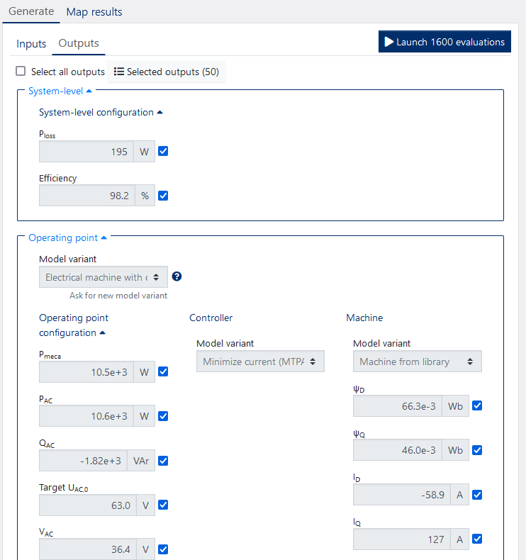 The output parameters are numerical fields considered as “performance” indicators. The list of selected output fields is summarized in Selected outputs (N: Number of selected outputs), and it is different depending on the topology of the design. These outputs include system-level parameters like power loss and efficiency, as well as many other detailed parameters regarding the operating point configuration, the switching controller, the cooling, the filter, etc.